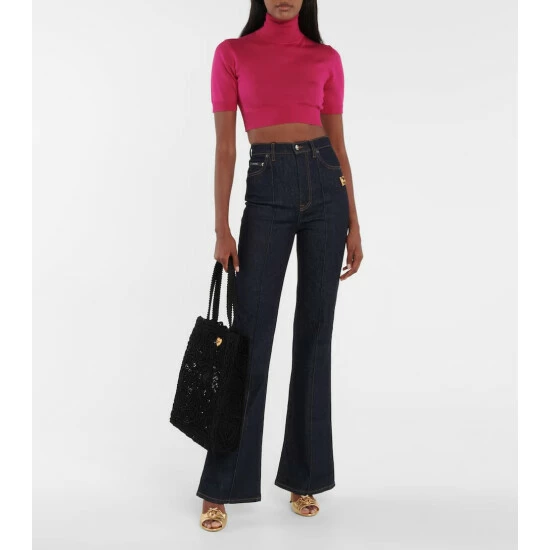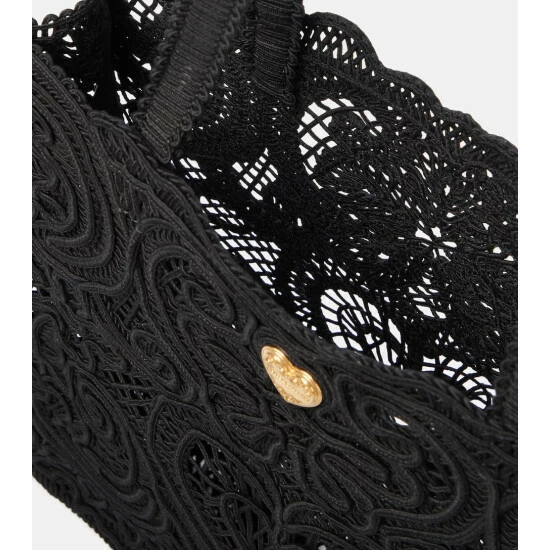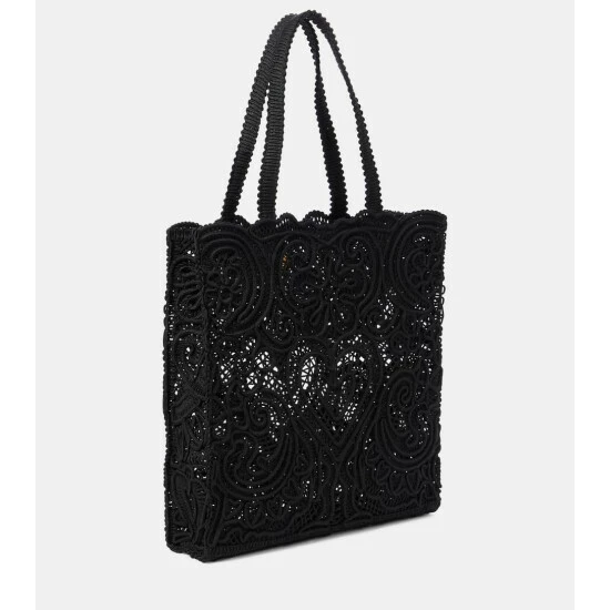 The black Beatrice tote from Dolce & Gabbana is made from cordonetto lace in a nod to the label’s appreciation of Sicilian craftsmanship. A signature heart embellishment at the front adds brand-typical glamor.