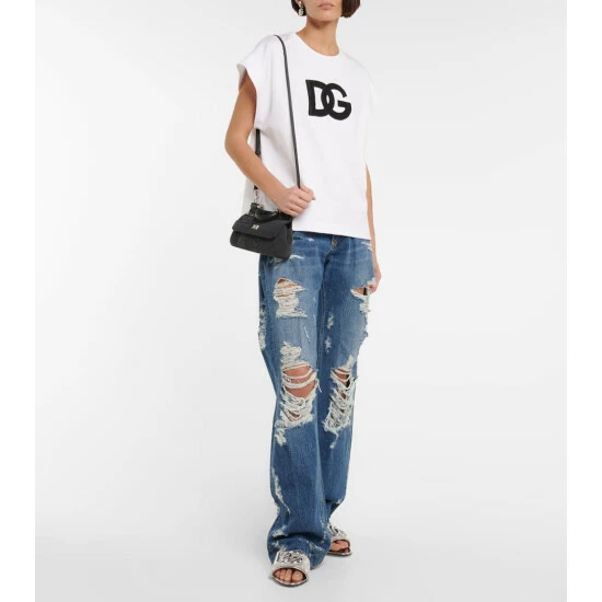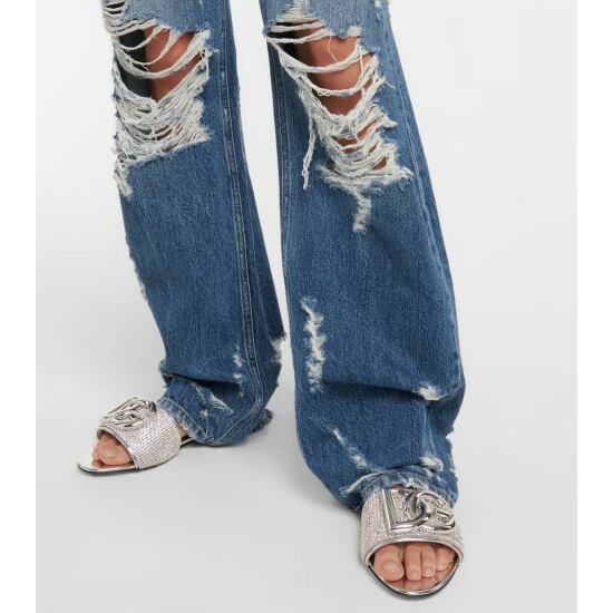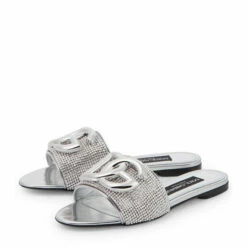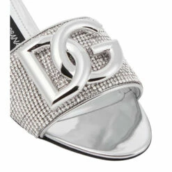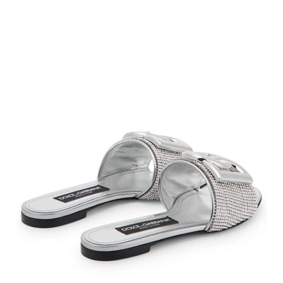 Dolce&Gabbana revamps the Bianca sliders in a rhinestone crystal-embellished design with mesh uppers and mirrored leather piping. They feature leather soles and the palladium-plated DG logo in metal hardware.