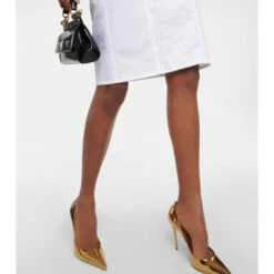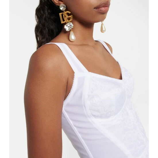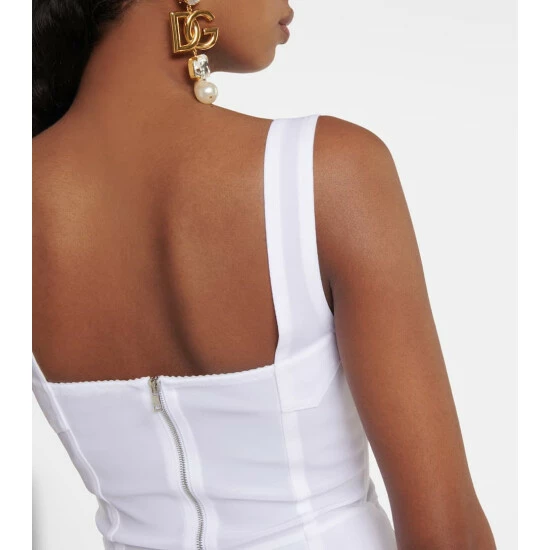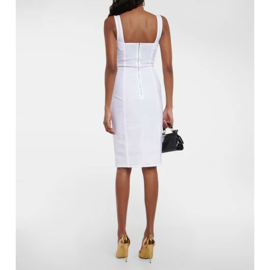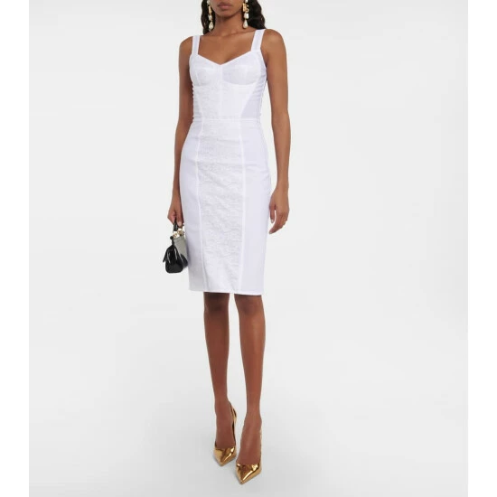 This bustier dress from Dolce&Gabbana is cut to a midi length in a fitted silhouette that’s zipped at the back. The sleeveless design features a sweetheart neckline framed by wide straps and is accented by tonal lace inserts in front.