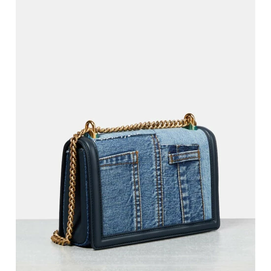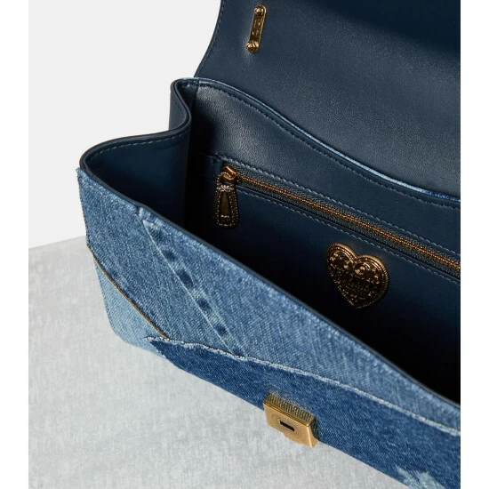 Dolce&Gabbana updates their iconic Devotion shoulder bag with a contemporary patchwork denim edition. Made in Italy, this leather-trimmed design features a bejeweled heart clasp.