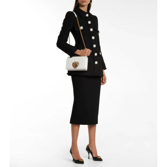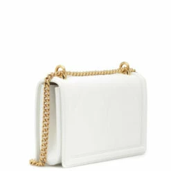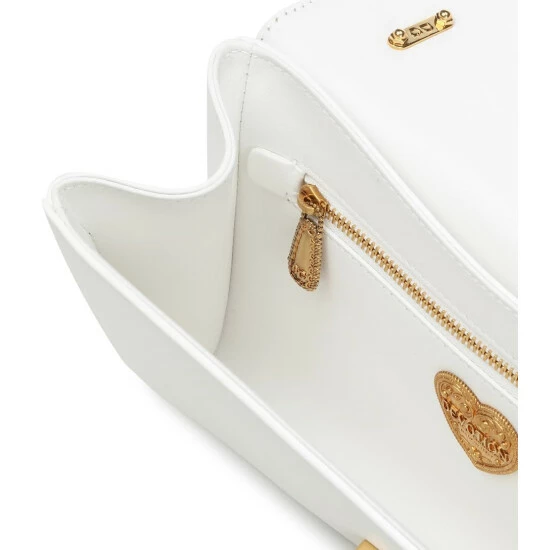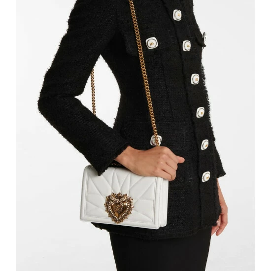 A wearable object of desire, the Devotion Medium shoulder bag from Dolce & Gabbana adds opulence to any look. Crafted in Italy from quilted nappa leather, it’s adorned with shining golden hardware, including a handmade heart in metal alloy with an inlay of faux pearls, which stands out against the optical white background. The jewelry-inspired chain strap can be adjusted to the perfect length. Carry yours next to romantic separates from the label to complete the look.