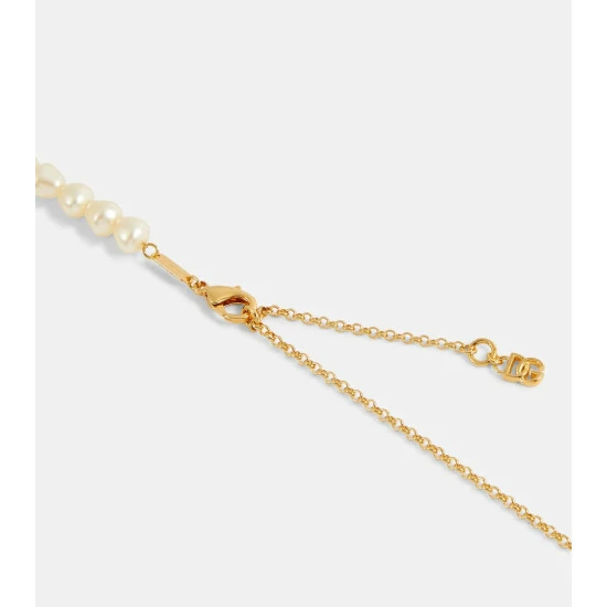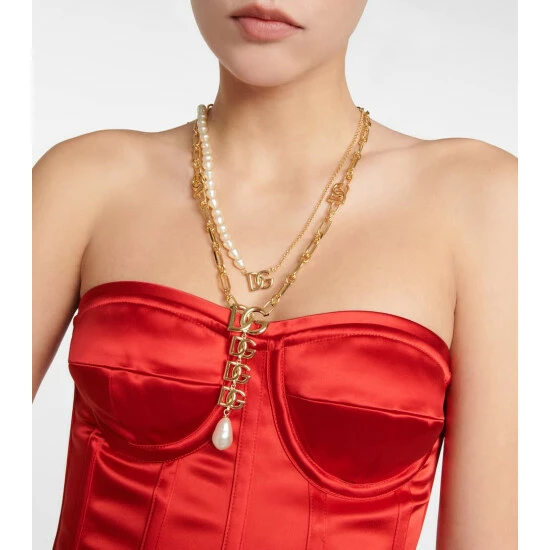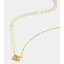 This necklace from Dolce & Gabbana is detailed with the fashion house’s interlocking monogram pendant – leaving no doubt as to its origins. Made from gleaming golden brass, it’s embellished with polished faux pearls.