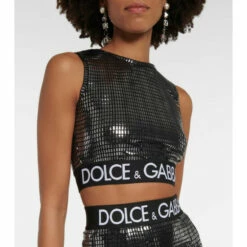 Dolce&Gabbana fuses athletic styling with futuristic detailing for this piece. This top is made in Italy and features a logo tape band, zipped back, and rectangular mirrored sequins throughout.