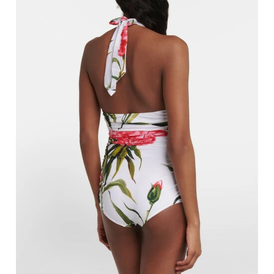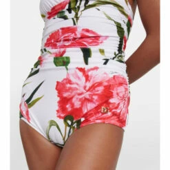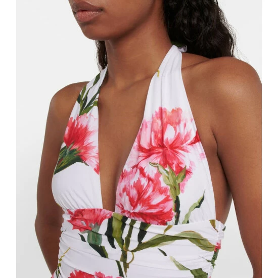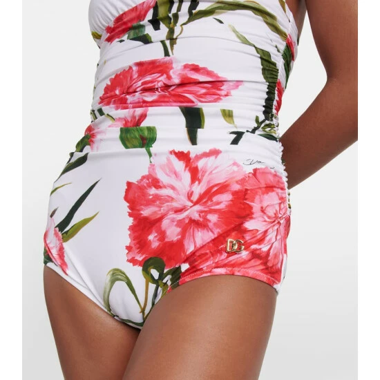 Channel Dolce&Gabbana’s signature glamour with this swimsuit, printed with the house’s elegant carnation motif. In a retro-inspired silhouette, it features a plunging V-neckline, flattering ruching throughout, and a subtle DG metal logo.