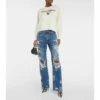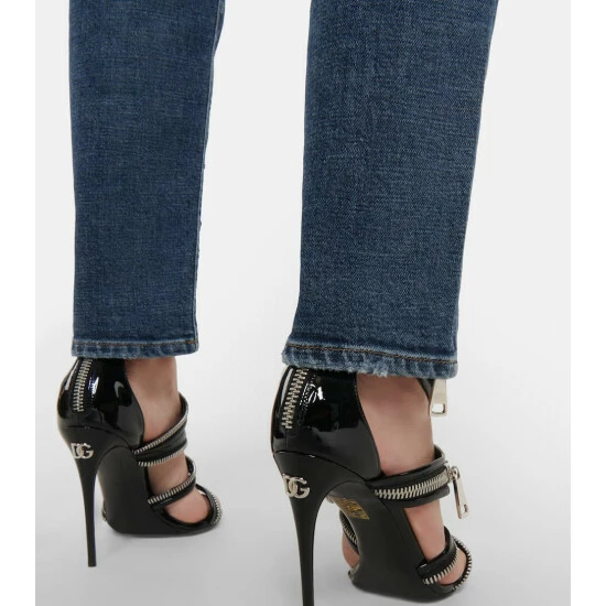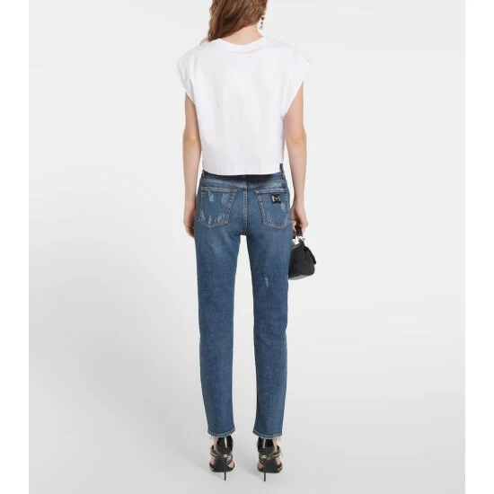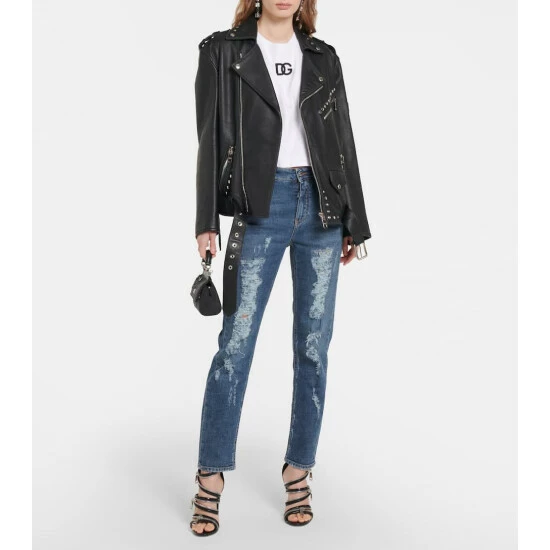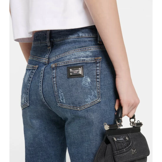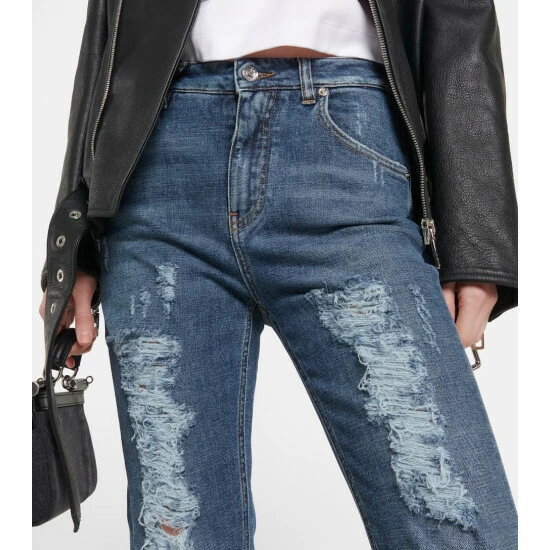 Heavy distressing along the legs lends these jeans from Dolce&Gabbana a cool, edgy feel. Made from denim in a faded blue wash, the pair has a high waist and a branded metal and leather appliqué.