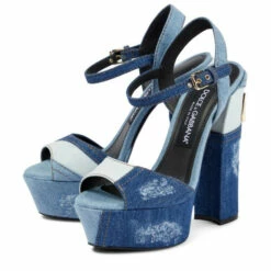 The Keira platform sandals are part of Dolce & Gabbana’s deep-dive into ’90s-era patchwork denim. Pieced together from panels of stone and mid-wash blue cotton, they have distressed details and 105mm block heels with DG hardware.