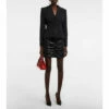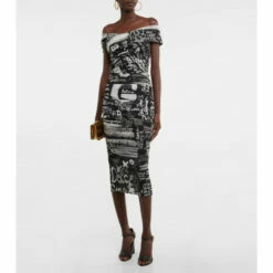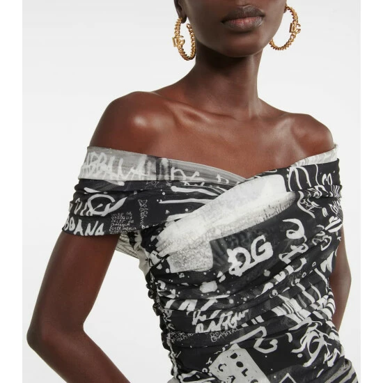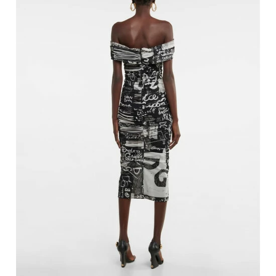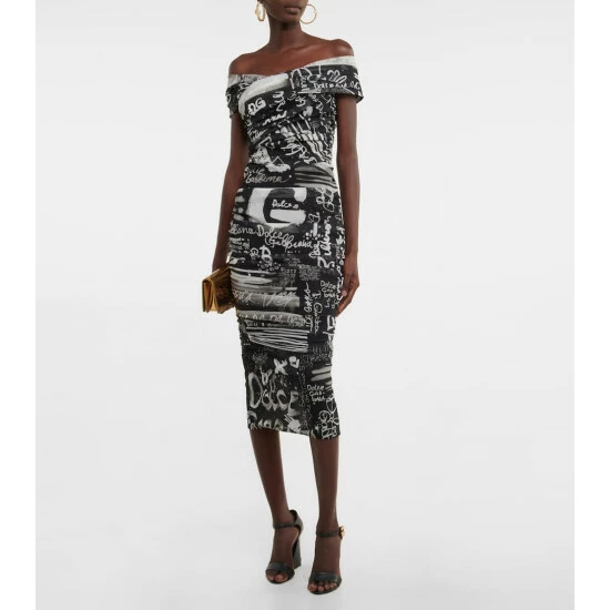 For an instant party-ready look, opt for this graffiti-inspired midi dress from Dolce&Gabbana. Made from semi-sheer tulle, it features an alluring off-shoulder silhouette, ruched detailing, and an artful logo print all over.