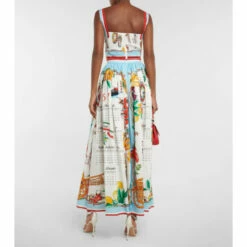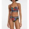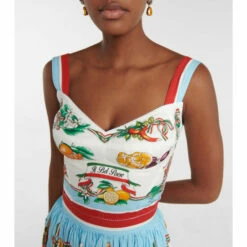 This bustier from Dolce&Gabbana has shaped cups, soft boning, and a shirred back panel. It’s made from cotton with a brand-characteristic fruit and vegetable print and finsihed with tri-color striped shoulder straps.