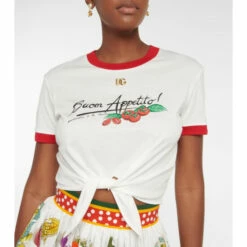 Dolce&Gabbana celebrates Sicilian culture with this cropped cotton jersey T-shirt. Featuring a “Buon Appetito” slogan and succulent tomato print, it’s finished with a metal DG monogram and knotted hem.