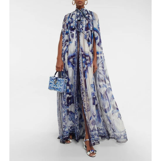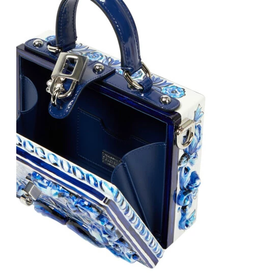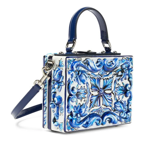This boxy clutch from Dolce&Gabbana inspired by Sicilian tiles, from its shape to the blue and white Majolica print that decorates it. The design is trimmed with a leather strap.