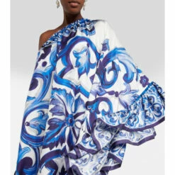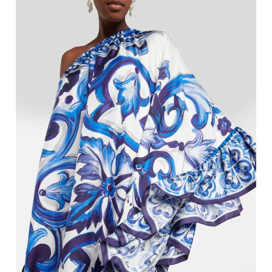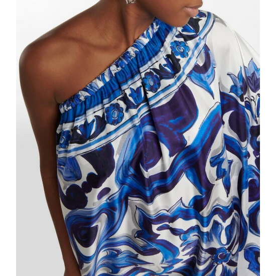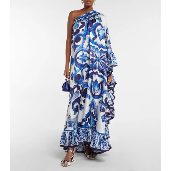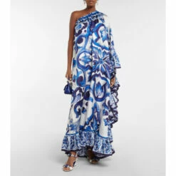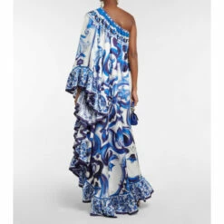 Maiolica-inspired motifs are one of Dolce&Gabbana’s trademark prints. Made from pure silk twill, this gown from the Blu Mediterraneo line has a one-shoulder neckline and a ruffled trim.