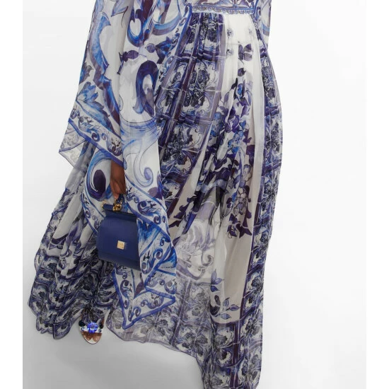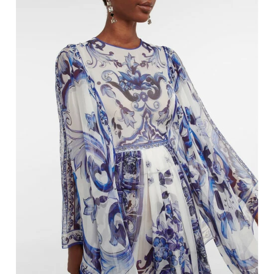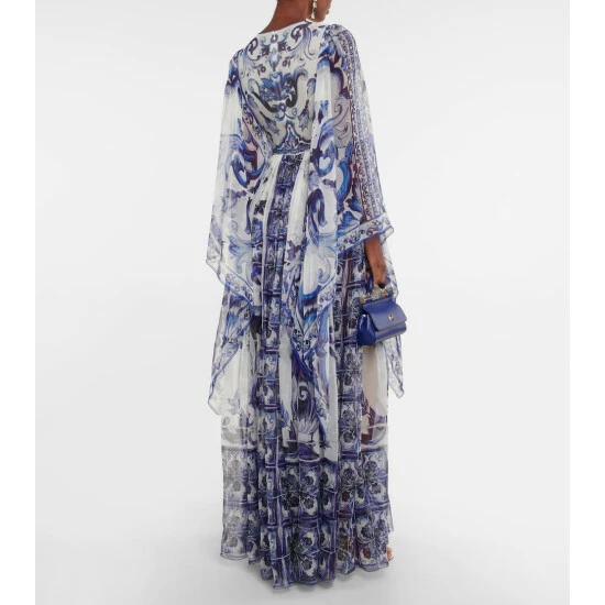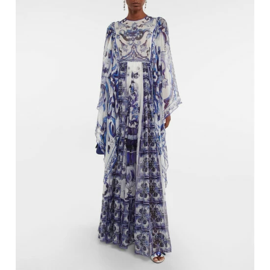 Part of Dolce&Gabbana’s Blu Mediterraneo line, this airy gown features signature Majolica-inspired motifs all over. It’s made from lightweight silk chiffon with wide sleeves and designed to flow beautifully as you move.