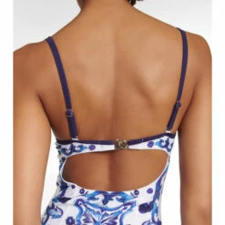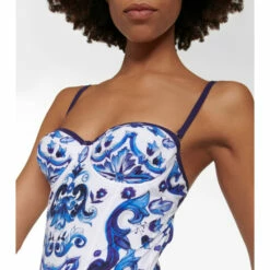 This Dolce&Gabbana swimsuit is a feminine style, defined by its boned bodice with defined cups and a slim-fitting silhouette. It features the brand’s majolica print with swirls of white and blue.