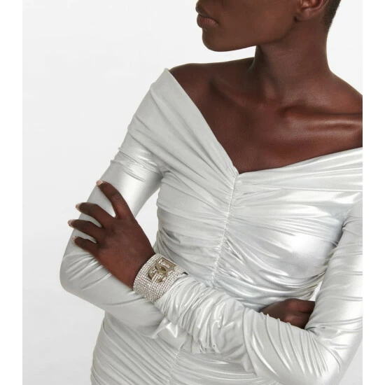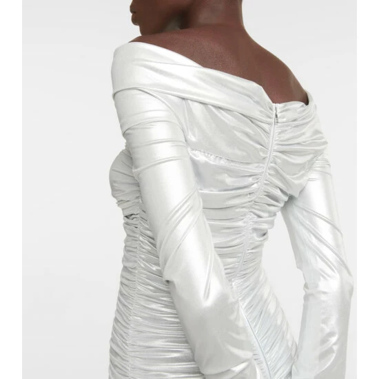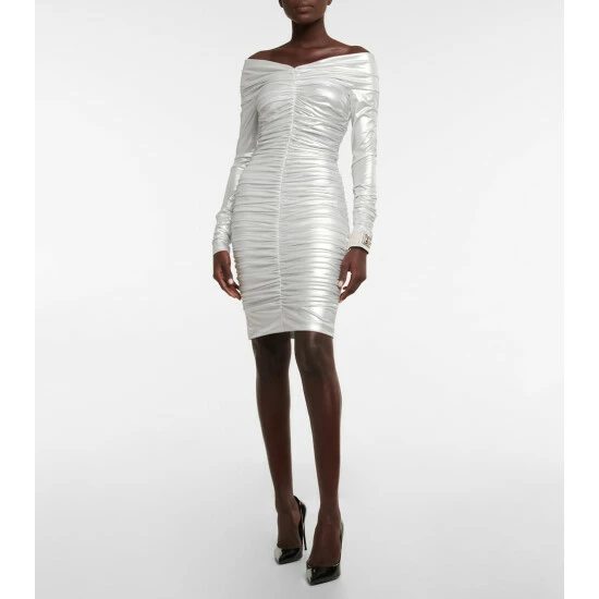 Dolce&Gabbana adds an element of depth to this minidress with all-over ruching. The high-shine design is made from a supportive stretchy fabric and has an off-shoulder cut and long sleeves.