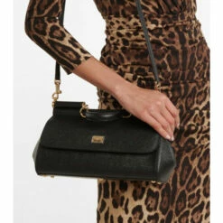 Dolce & Gabbana expands its Sicily bag family with this Medium crossbody iteration. Made from grained black leather, it has a baguette silhouette, a detachable shoulder strap and gleaming golden hardware.