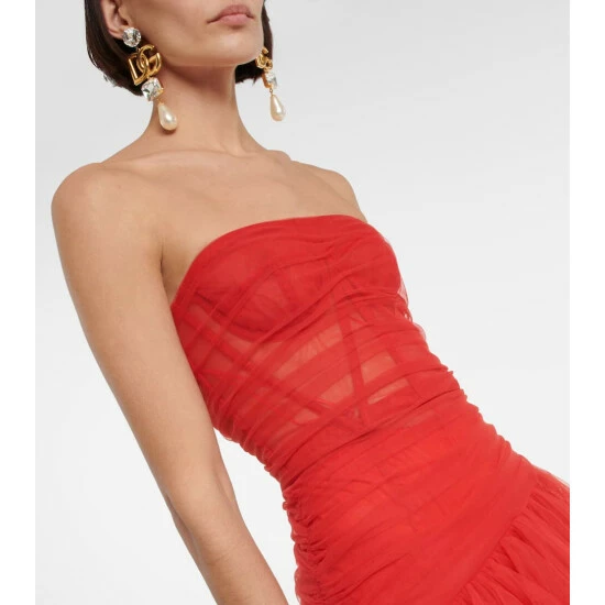 This strapless ruched minidress from Dolce&Gabbana is a perfect tulle layering piece. Made in Italy, this ruffled design has a partial silk-blended lining, a structured boning bodice, and underwired cups for additional support.