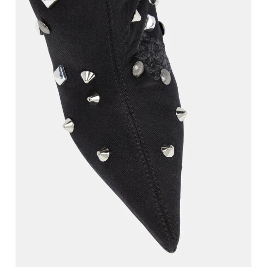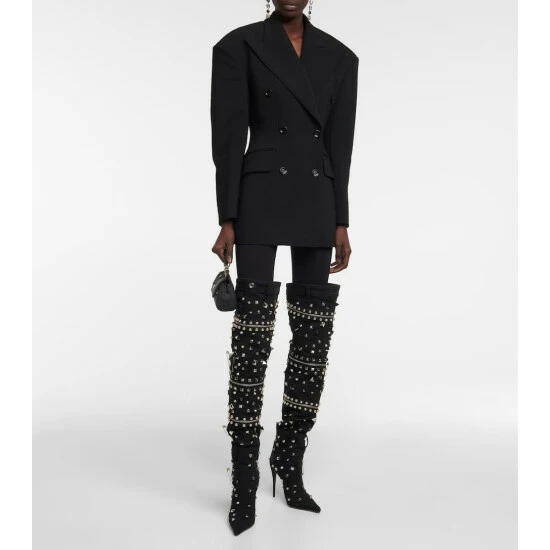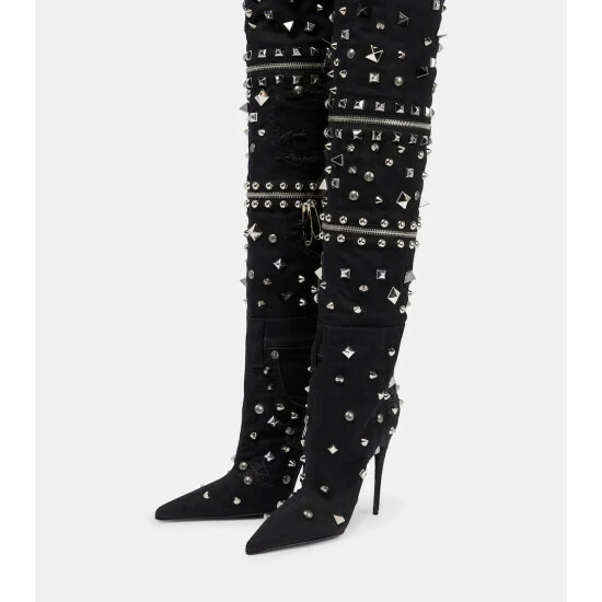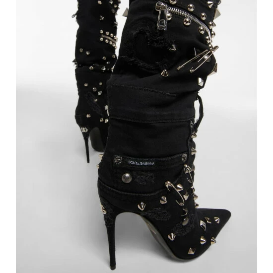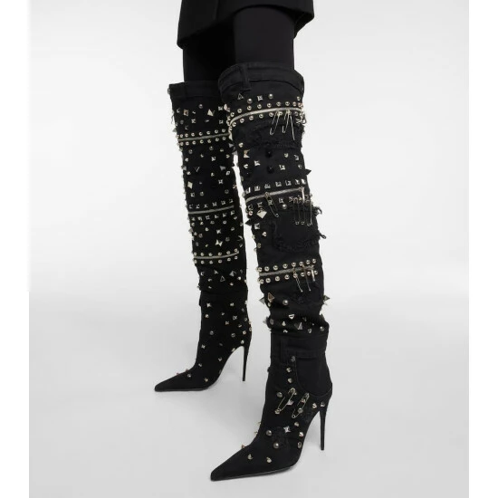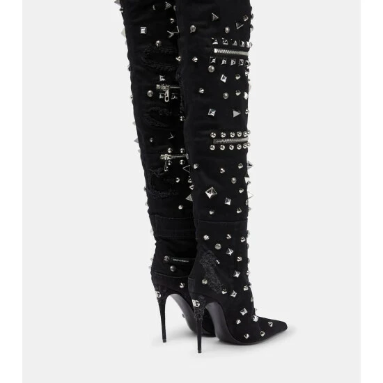 Make a statement in these over-the-knee boots from Dolce&Gabbana. Made in Italy from patchwork denim, the pointed-toe style is embellished with silver-toned studs, pins, and zippers, and features the brand’s DG logo on the heel.